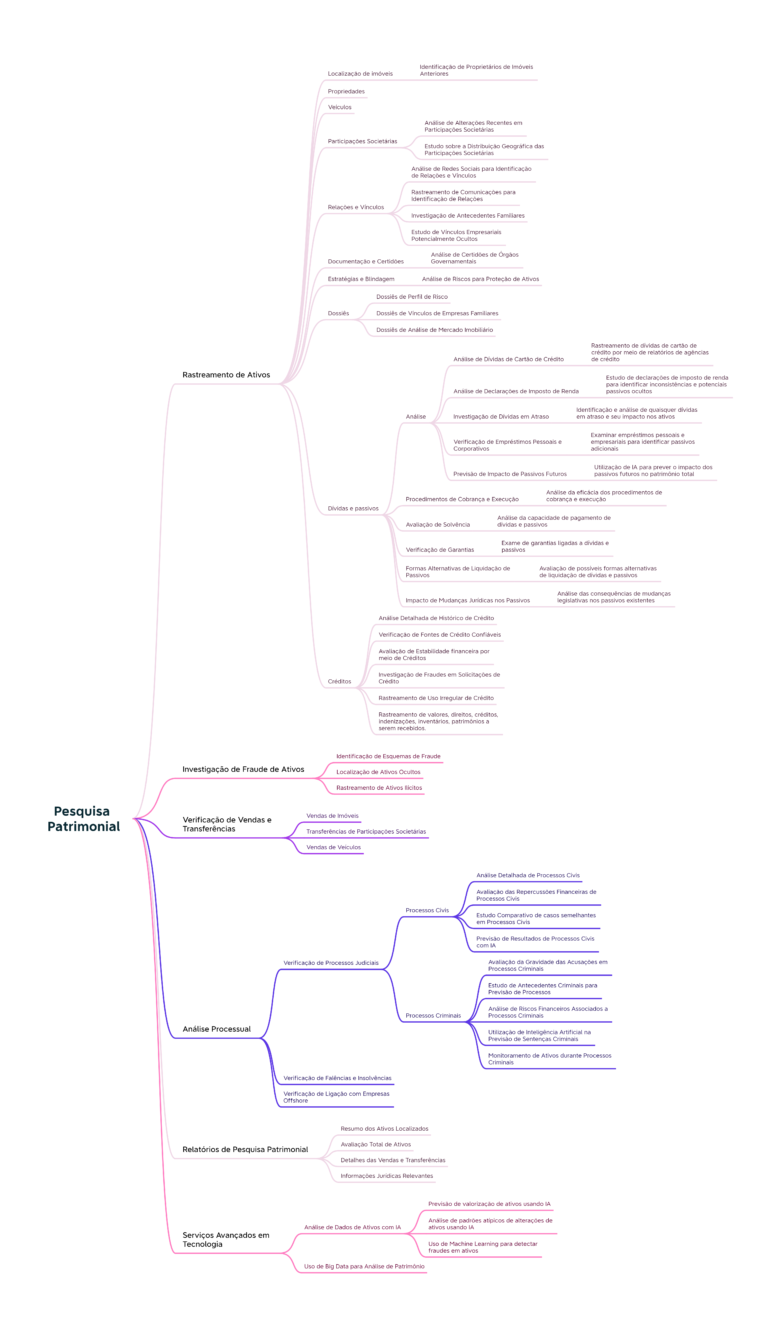 Nossa diligência abarca a varredura de informações vitais, que incluem, mas não se limitam a, dados cadastrais de Pessoas Jurídicas e Físicas, inventários imobiliários, frotas de veículos, aeronaves, embarcações, propriedades rurais, litígios vigentes em território nacional, históricos criminais, participações societárias e responsabilidades creditícias. Através de nossos processos, estabelecemos um percurso jurídico seguro, conduzido com integridade e celeridade.
